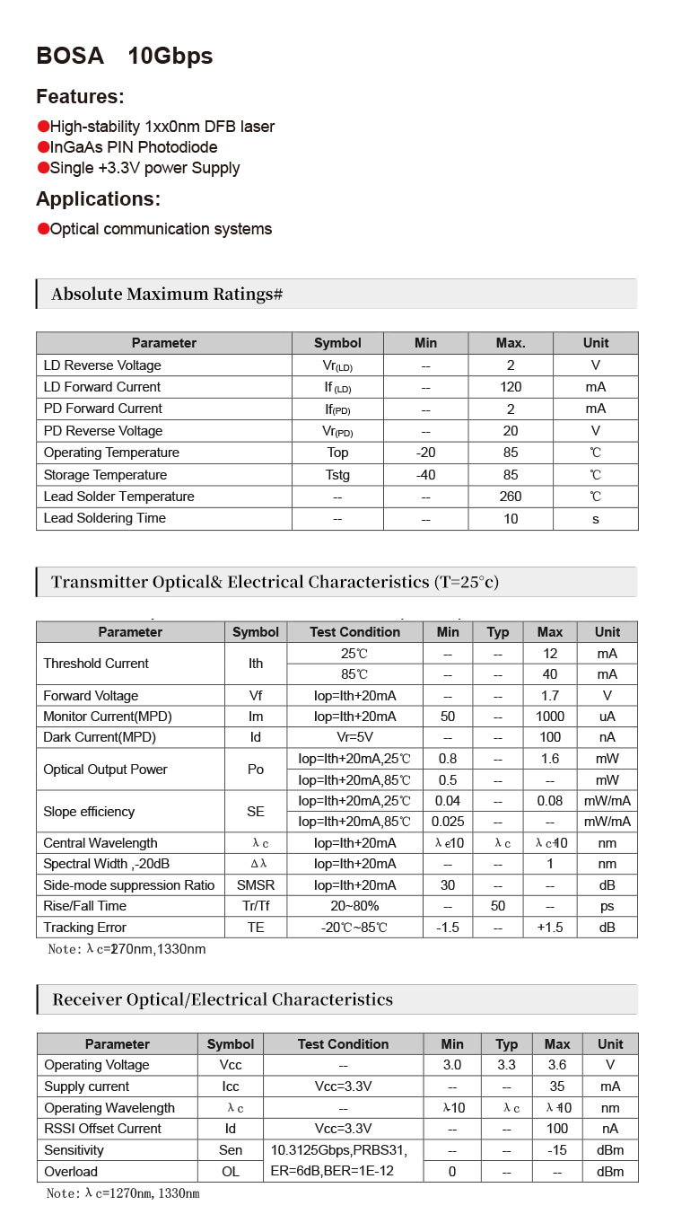 BOSA 10Gbps Bi-Directional Optical Sub-Assembly